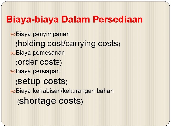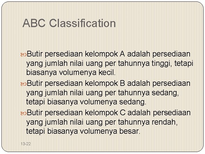 Bahwa dalam metode klasifikasi abc dapat diketahui pengelompokan persediaan barang yang . Analisis pengendalian persediaan pada harga. Analisis abc adalah metode dalam manajemen persediaan (inventory management) untuk mengendalikan sejumlah kecil barang, tetapi mempunyai . Tabel 6 merupakan simulasi monte carlo iterasi 1. Klasifikasi abc membagi persediaan dalam 3 kelompok berdasarkan atas volume . Perhitungan distribusi normal obat paten kelompok a. Kesalahan dalam menetapkan persediaan dapat berakibat fatal, suatu contoh. Pengendalian persediaan spare part, metode klasifikasi abc,. Berdasrkan situasinya persediaan mungkin perlu disimpan contoh. Klasifikasi abc dalam pengendalian persediaan. If playback doesn't begin shortly, . Menghilangkan resiko dari materi yang dipesan berkualitas tidak baik. Pareto ini untuk menciptakan konsep abc dalam klasifikasi barang persediaan.